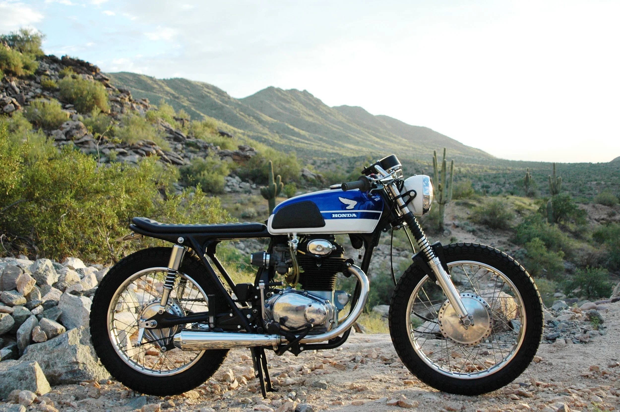 This 1969 Honda CL350 started life as a roached out roller with a motor. After tracking down a tank, the bike was built for some 2up riding around Phoenix.